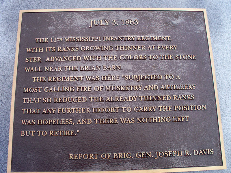 Located on Seminary Ridge across from the North Carolina Memorial a rare Confederate Regimental marker can be found. The 11th Mississippi Infantry memorial is placed near where the regiment formed for battle on the afternoon of July 3, 1863. On the monument is Sergeant William O’Brien of Company C raising the flag & urging his comrades forward. Sergeant O’Brien was the first of 8 color bearers who were either killed or wounded during Pickett’s ill-fated charge. For the true Gettysburg “buff” there is a second marker to this unit located near the stone wall at the Bryan Barn noting the farthest advance of the remnants of this regiment on July 3rd. The 11th Mississippi entered the battle with 592 men – of these, 102 were killed, 168 wounded & 42 listed as missing or captured; a staggering 53%.